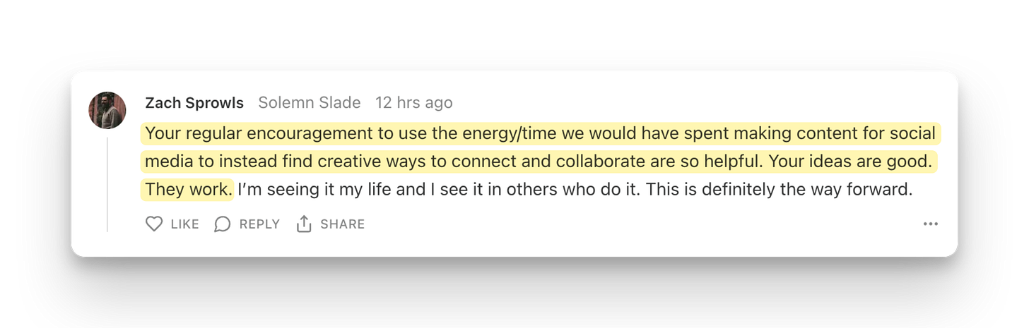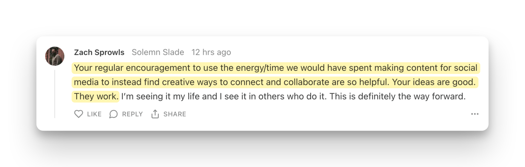 Let’s find ways to expand our work with other people, in real life, in smaller networks, instead of giving our best work to Zuckerberg and Musk, because social media thrives on the illusion of its necessity.
