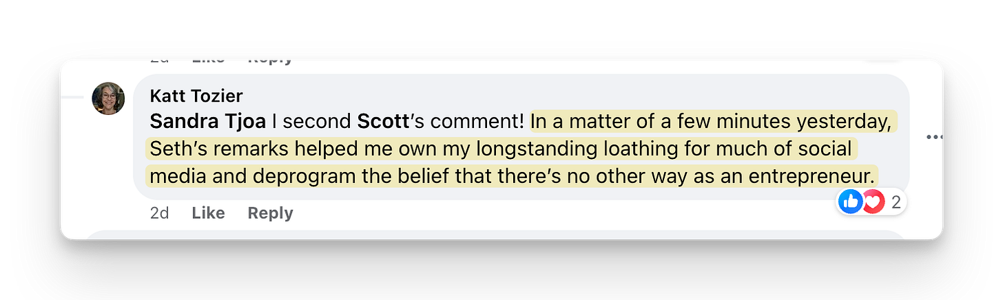 Because social media loses power when we build community in other places.That’s why your next big breakthrough will happen with other creative people. It’s a big world out there, filled with lots of creative people, and that’s why opportunities exist outside of social media.